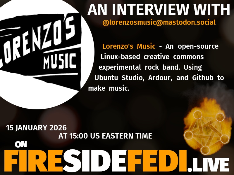 A dark image. The background is unclear and blurry. On the foreground on the left there is a huge circle, inside of which a profile picture belonging to @lorenzosmusic@mastodon.social. On the other side, a bit lower in the frame we see a fediverse logo, but on fire. This is the logo of the Fireside Fedi show. In between those two elements a text is written. This text says:
